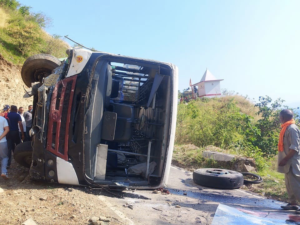 Himachal Pradesh अर्की के सरयांज में बीच सड़क पर पलटी HRTC बस